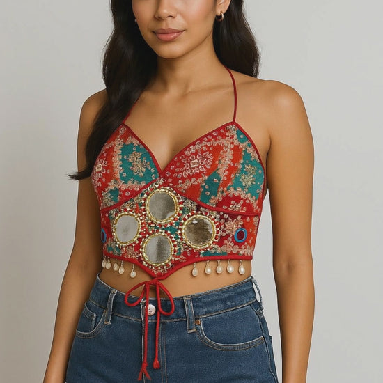 Fiery, fearless, and magnetic, The Siren is for the woman who turns heads without trying. Hand-embroidered in bold tones of red, green, and orange, this luxe statement top embodies celebration, strength, and the beauty of standing out.