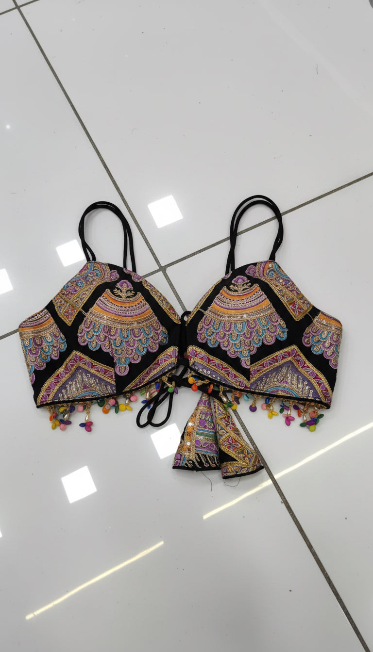 Each top is handcrafted on blended fabric with real mirror and thread work. Fully lined for comfort, featuring shoulder straps and a tie-back for that perfect custom fit.