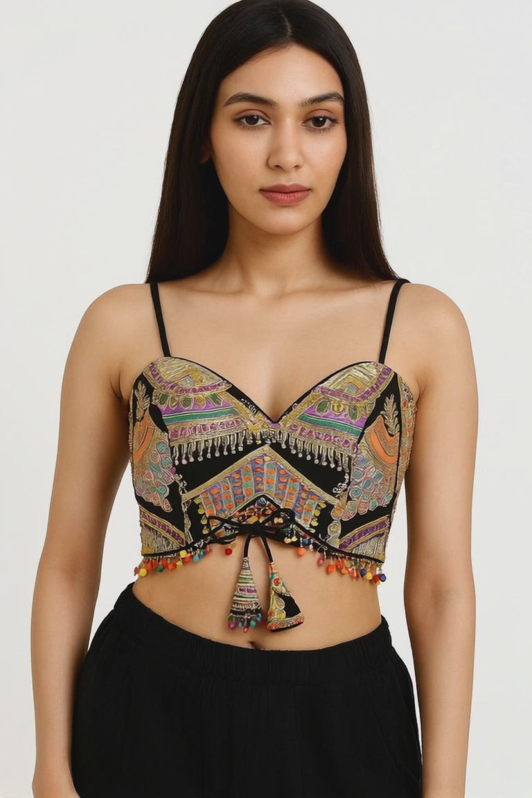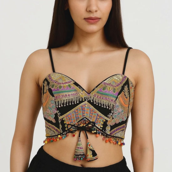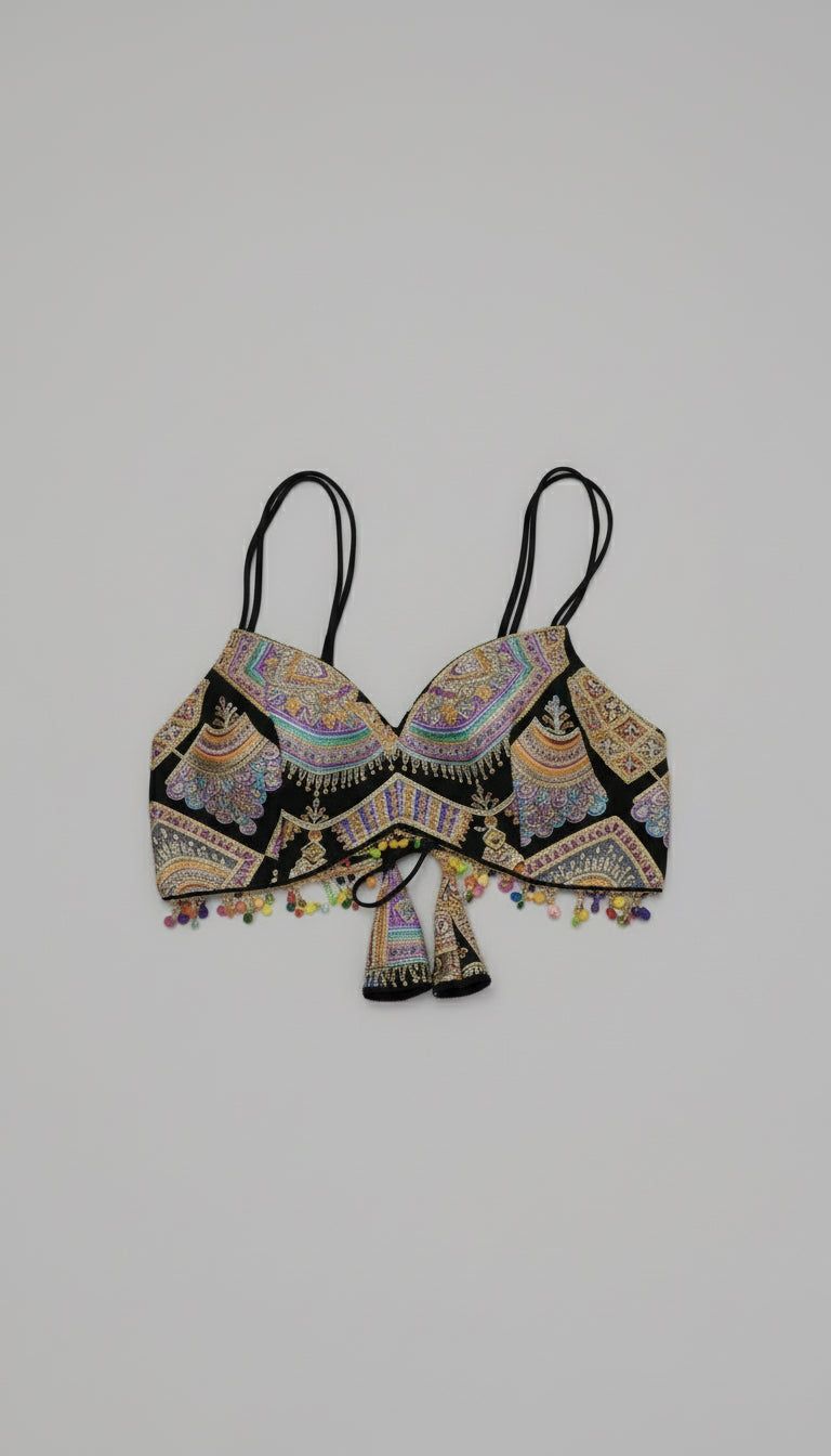 Made for nights out, weddings, music festivals or that one rooftop party you’ll never forget — this piece catches light from every angle. The soft black base lets the embroidery shine in jewel tones of lilac, gold and turquoise, while the playful tassel ties and pom-pom trim keep it fun and flirty.